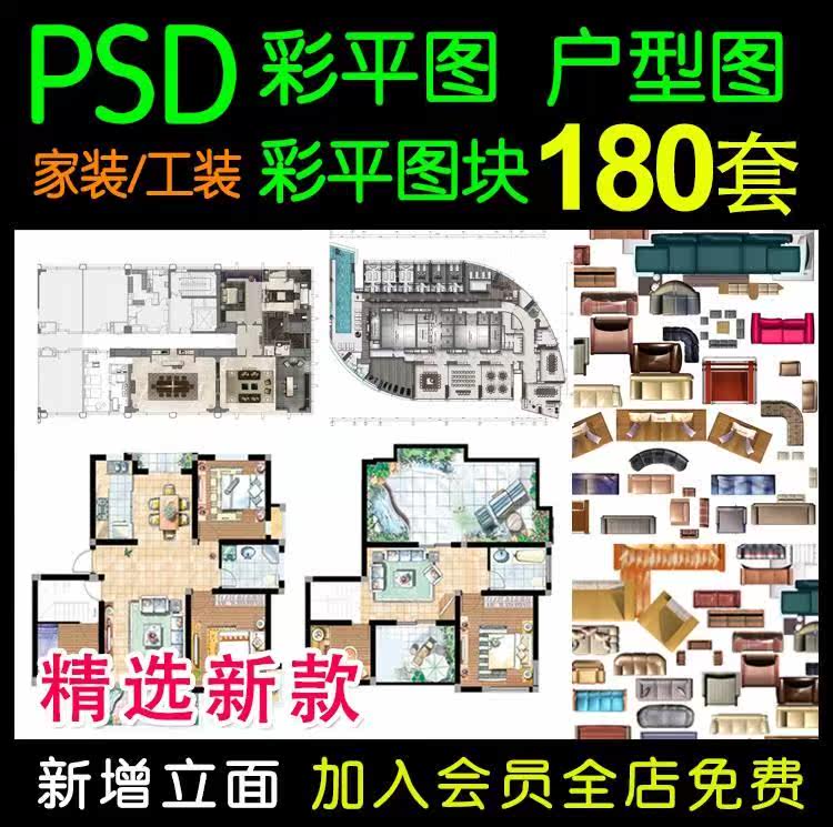 彩色平面PSD户型图手绘 室内设计家装二三四居室彩平图分层ps素材热门设计联盟服务商
