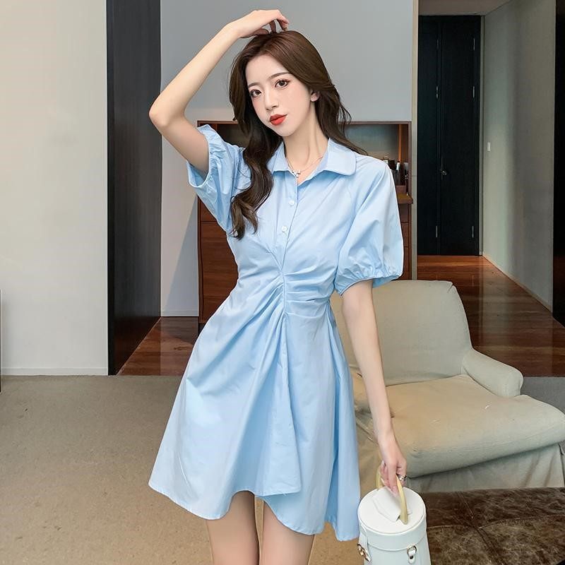 2021夏季新款韩国东大门纯色气质泡泡袖褶皱短袖设计感衬衣连衣裙热门设计联盟服务商