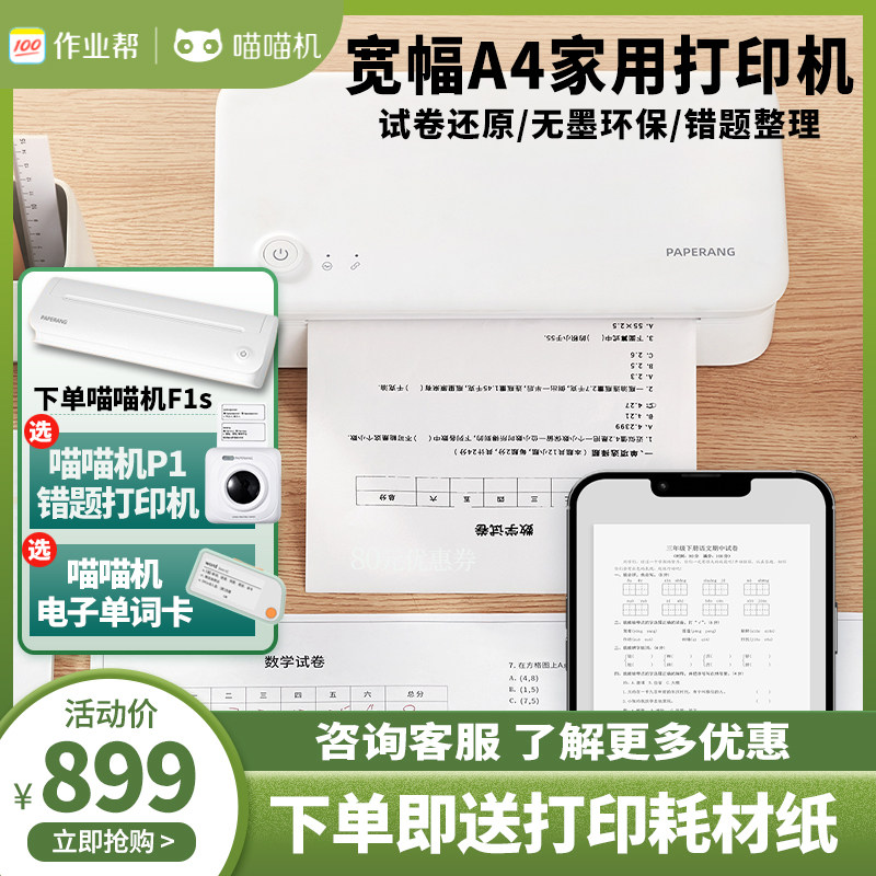 喵喵机F1/F1S家用办公作业打印机小型A4尺寸学生智能手机蓝牙连接家庭wifi移动远程便携式官方错题打印整理热门设计联盟服务商