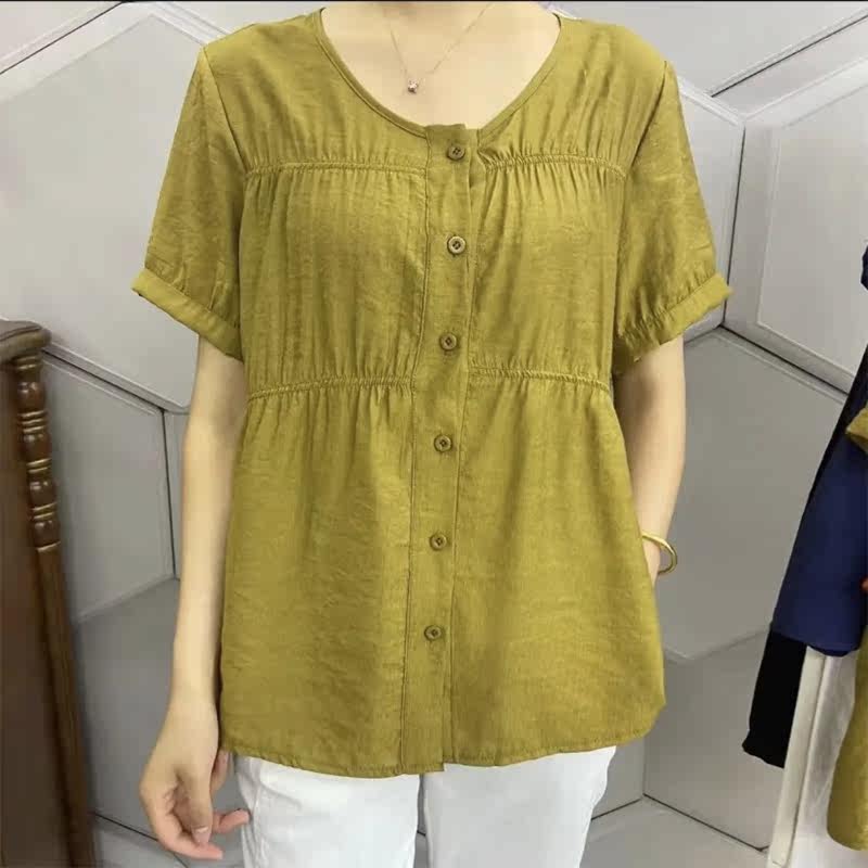 朱效荣服饰2021夏季纯色简约减龄妈妈装天丝麻圆领短袖衬衫C881热门设计联盟服务商