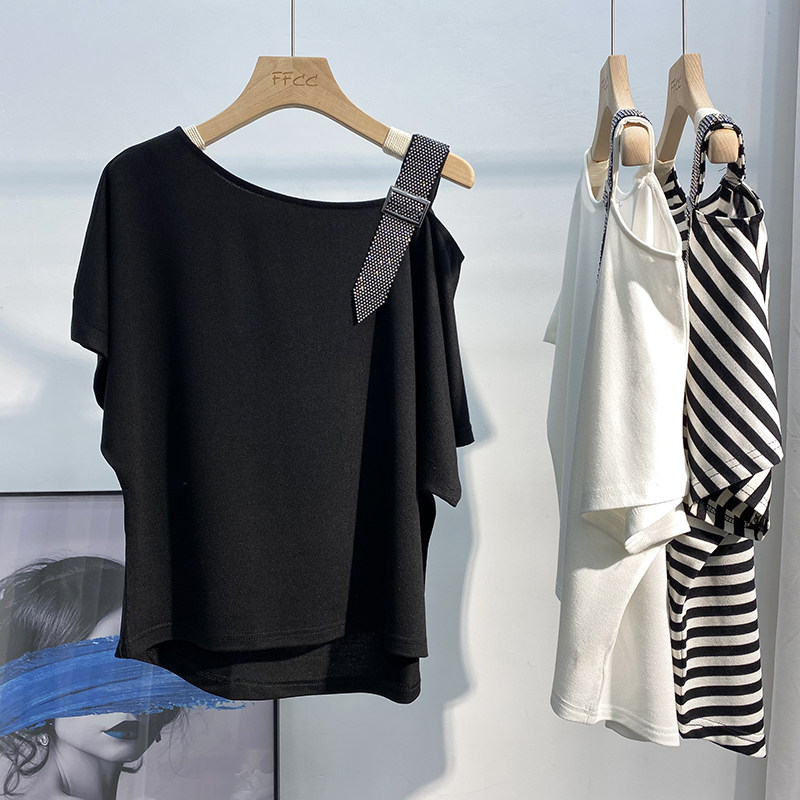 一字漏斜单边不规则条纹露肩短袖t恤女夏季带烫钻设计感小众上衣热门设计联盟服务商