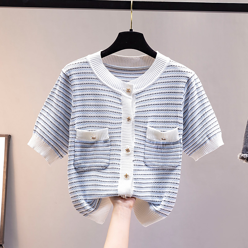 小香风上衣女夏短袖t恤设计感2021新款开衫短款外套冰丝V领针织衫热门设计联盟服务商