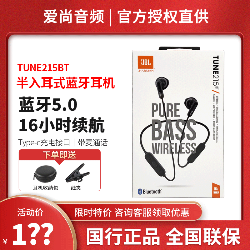 JBL TUNE215BT无线蓝牙耳机运动半入耳挂脖式耳麦跑步运动T215BT热门设计联盟服务商