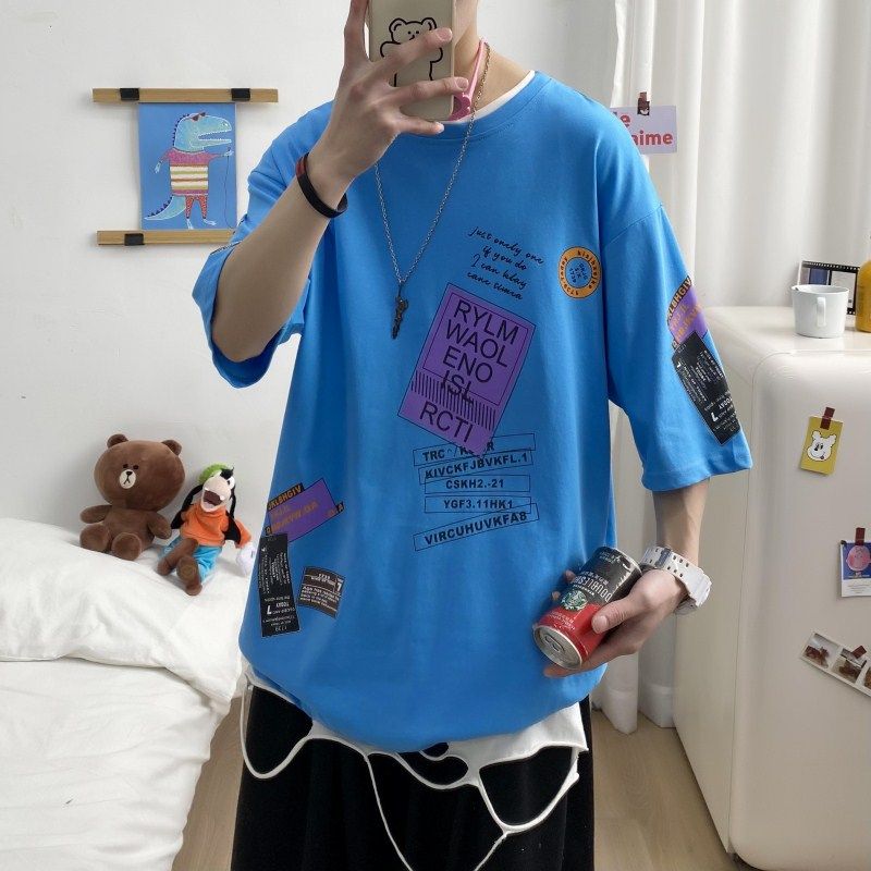 国潮原创宽松短袖t恤男夏季新款字母图标上衣半袖圆领5分袖体恤男热门设计联盟服务商